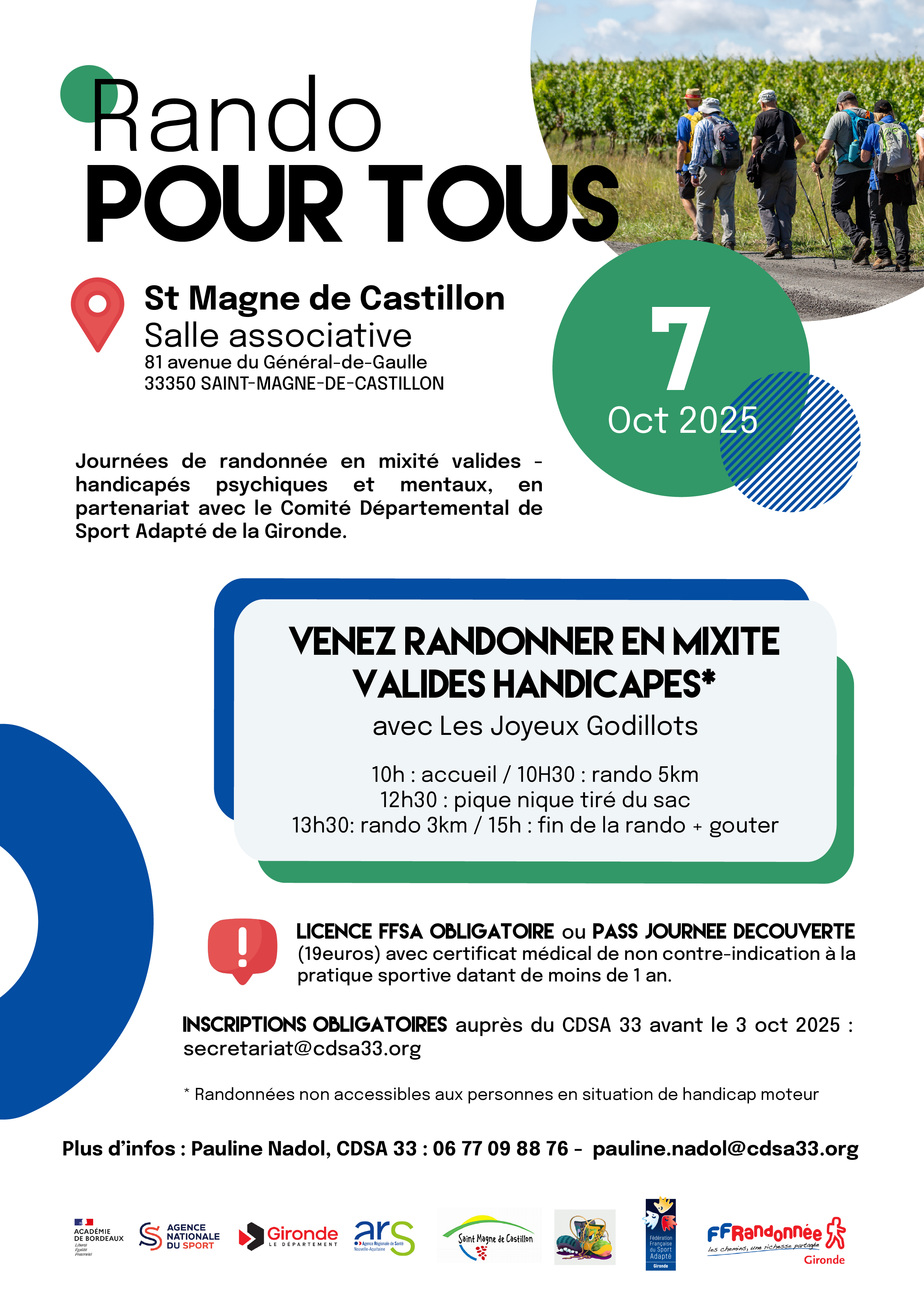 Le Comité Départemental du Sport Adapté de la Gironde a le plaisir de vous informer qu’il organise, le mardi 7 octobre 2025, une journée Rando Pour Tous à St Magne de Castillon, en partenariat avec le Comité Départemental de Randonnée de Gironde et le club local Les Joyeux Godillaux.